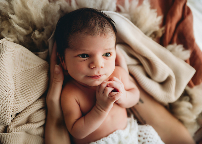 The best time to photography newborns is in their first 14 days of life, ideally between 6 and 10 days old, this is when they are all still nicely curled and sleepy. After 14 days, bubbas become more alert and less curled. It is recommended that you book your session while you are still pregnant.